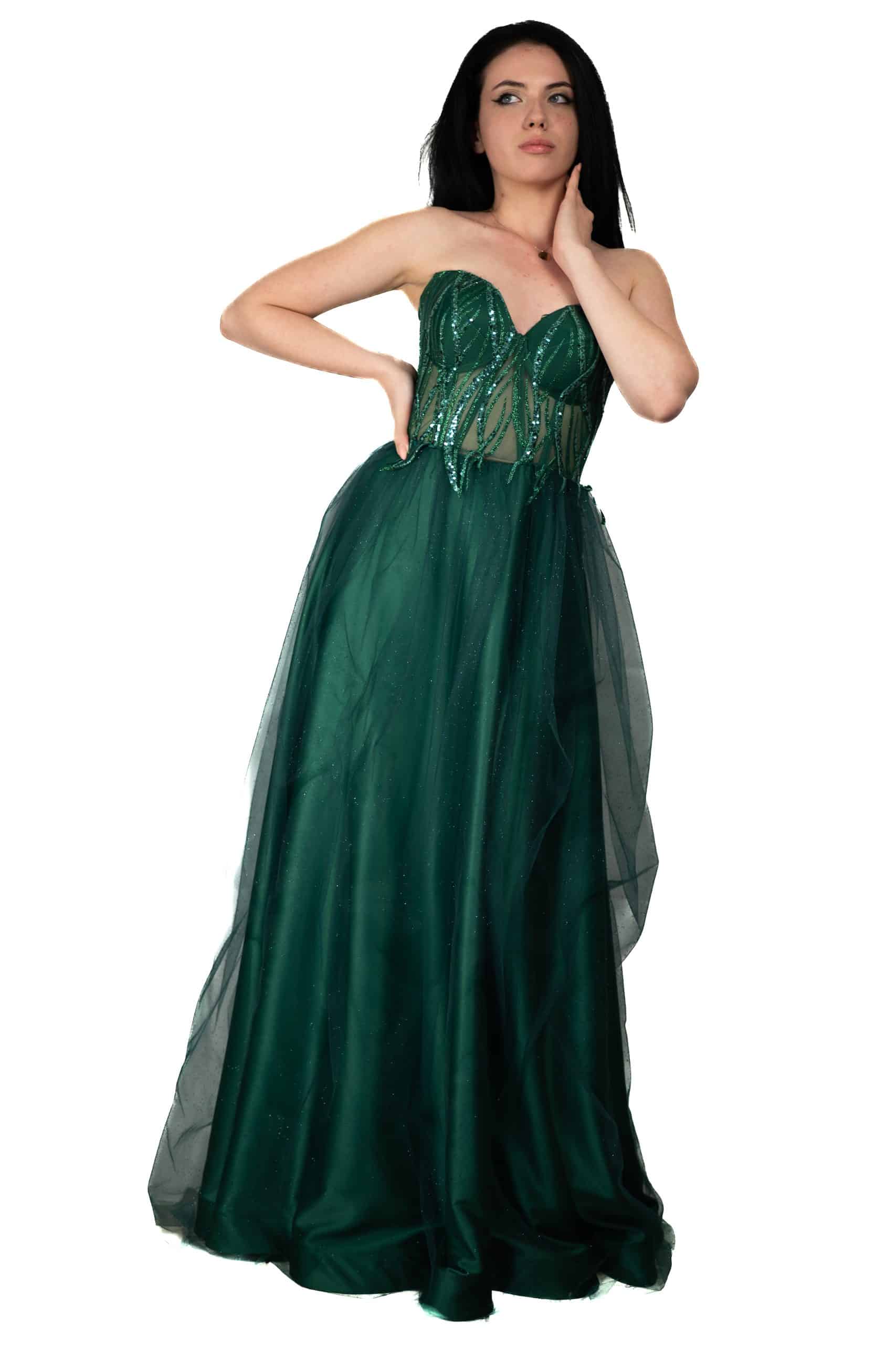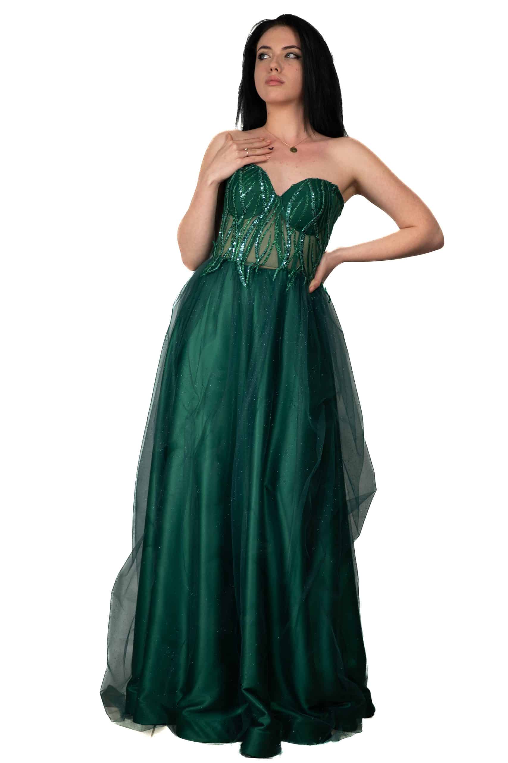 Впечатляваща бална визия с хиляди блестящи частици в А линия. Облечен корсет с брокатена дантела и сатенена пола обгърната с брокатен тюл. Подходяща за бал, кума и други поводи.