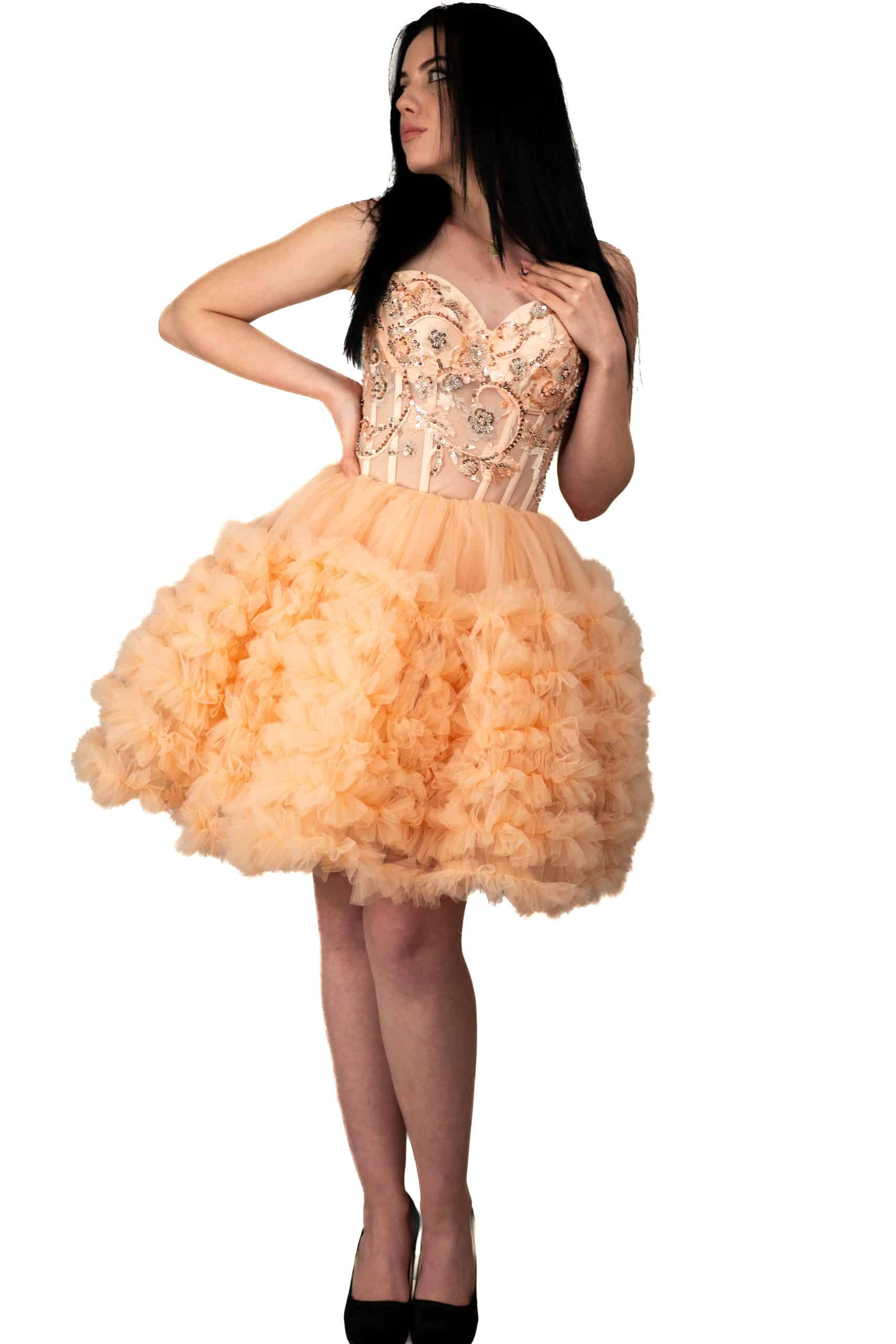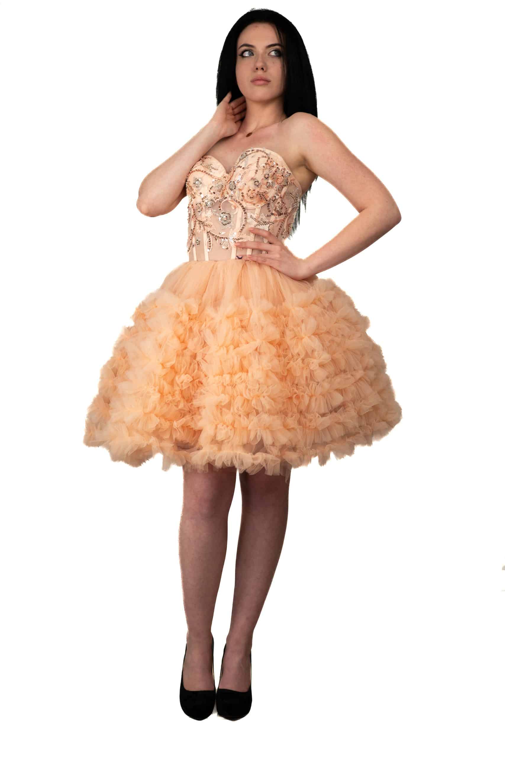 Мини роля с богато окрасен корсет и разкроена пола с напластен тюл на редове. Подходяща за рожден ден, коктейл, шаферка и бал.