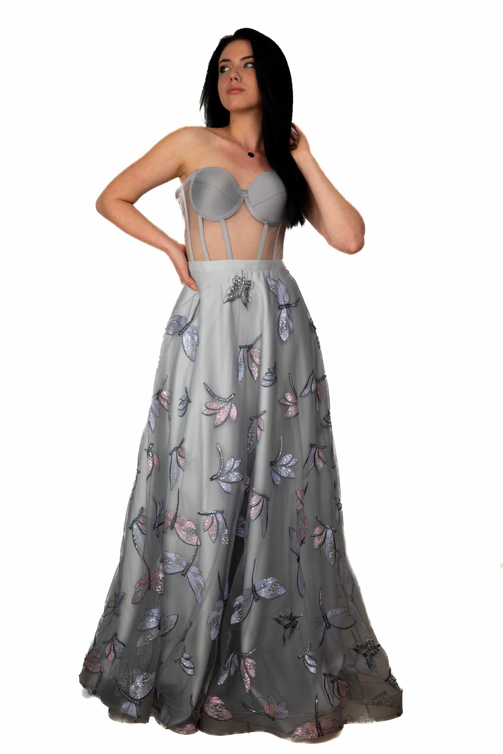 Изчистен сив корсет с разкроена сатенена пола която е окрасена с нежен тюл на морски кончета. Подходяща за официални поводи, морска сватба и коктейли.